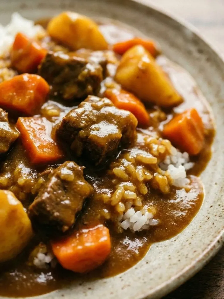 Curry japonais : Doux, épais, légèrement sucré avec une texture de sauce brune veloutée. Base de roux (farine + beurre + curry). Saveur équilibrée, réconfortante, jamais très piquante.